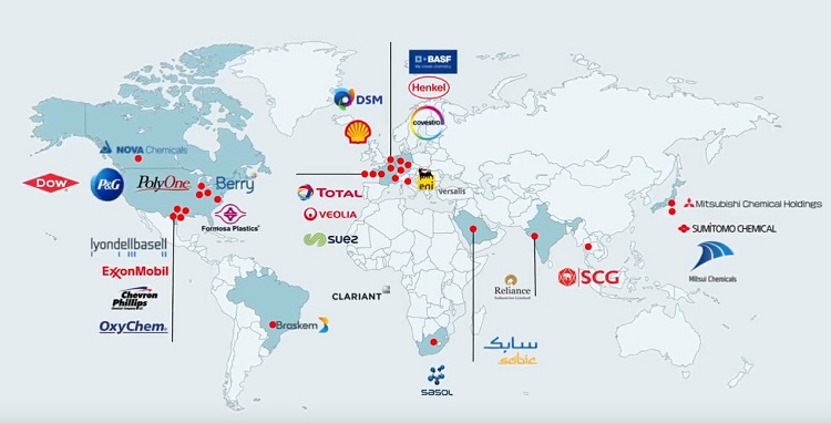 The following companies are the founding members of the Alliance: BASF, Berry Global, Braskem, Chevron Phillips Chemical Company LLC, Clariant, Covestro, Dow, DSM, ExxonMobil, Formosa Plastics Corporation USA, Henkel, LyondellBasell, Mitsubishi Chemical Holdings, Mitsui Chemicals, NOVA Chemicals, OxyChem, PolyOne, Procter & Gamble, Reliance Industries, SABIC, Sasol, SUEZ, Shell, SCG Chemicals, Sumitomo Chemical, Total, Veolia, and Versalis (Eni).