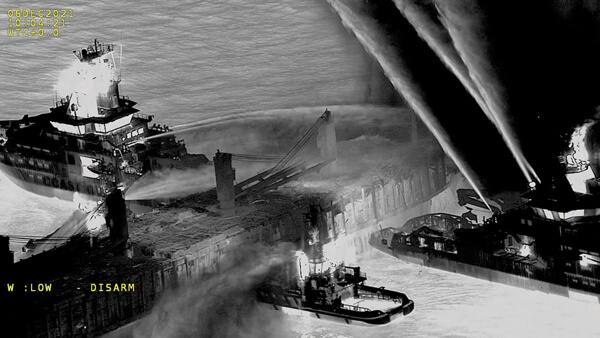 The vessel has been repositioned to reduce the wind from pushing the fire aft. At this point, the vessel was operational with the crew working to assist the firefighting efforts. The Coast Guard has also brought in thermal camera to identify the center of the fire and is employing a drone from the local rescue service to provide live images and heat conditions aboard the vessel.