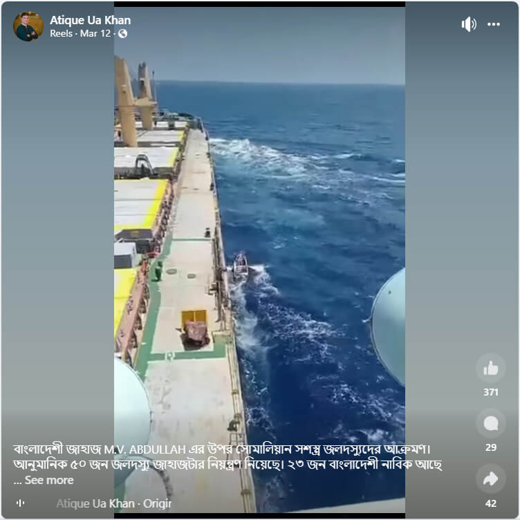 The vessel now named Abdullah (58,000 dwt) was acquired in late 2023 by the company in Bangladesh from Japanese owners and only recently resumed sailing. Built in 2015, she is 623 feet (190 meters). A crewmember from the ship who was a former cadet at the country’s Maritime Academy was able to send messages to one of his instructors including a video of the pirates’ approach pleading for assistance.
