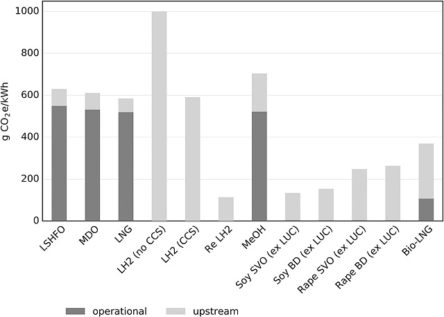 The figure below shows lifecycle emissions in terms of carbon dioxide equivalents, distinguishing between upstream and operational emissions.