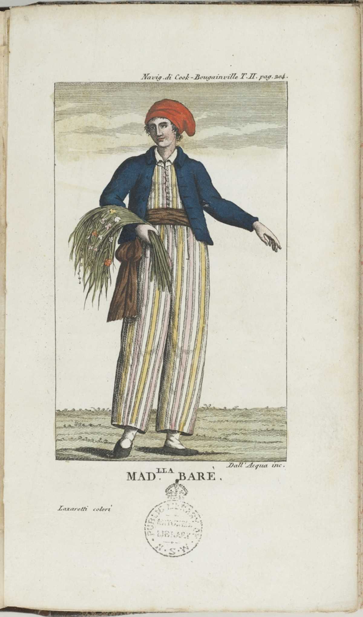 Jeanne Barret (also Baret or Baré) was the first woman known to have circumnavigated the world. Abandoning her bonnet and apron for men’s trousers and coats, she disguised herself as a man and signed on as assistant to the naturalist Philibert Commerson on one of the ships of Louis-Antoine de Bougainville’s expedition around the world.