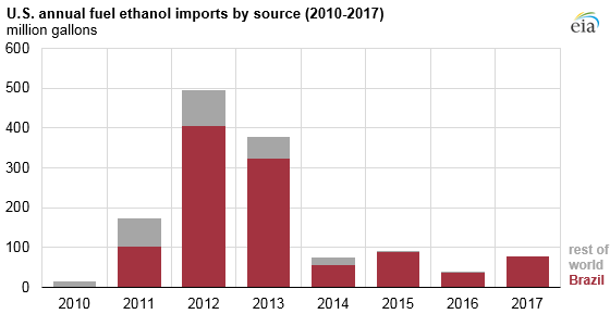 The U.S. has seen continued growth in fuel ethanol exports over the past eight years, as increases in both corn production and ethanol production capacity have outpaced domestic fuel ethanol consumption. U.S. fuel ethanol was exported to 35 countries in 2017, but more than half of all exported fuel ethanol went to Brazil and Canada.