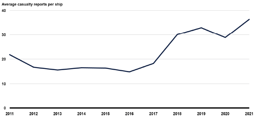 Average of Category 3 and 4 casualty reports per ship per year for 10 select vessel classes (GAO)