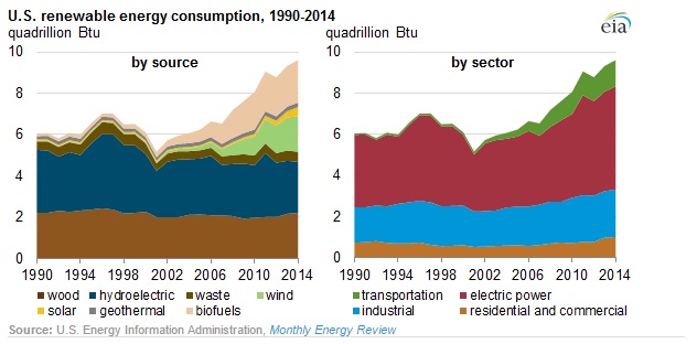Renewable energy use grew an average of 5% per year over 2001-2014 from its most recent low in 2001. The increase over the past 14 years was in part because of growing use of wind, solar, and biofuels. Wind energy grew from 70 trillion Btu in 2001 to more than 1,700 trillion Btu in 2014. During the same period, solar energy (solar thermal and photovoltaic) grew from 64 trillion Btu to 427 trillion Btu, and the use of biomass for the production of biofuels grew from 253 trillion Btu to 2,068 trillion Btu. Hydroelectricity was the largest source of renewable energy in 2014, but hydro consumption has decreased from higher levels in the mid-to-late 1990s. Wood remained the second-largest renewable energy source, with recent growth driven in part by demand for wood pellets.