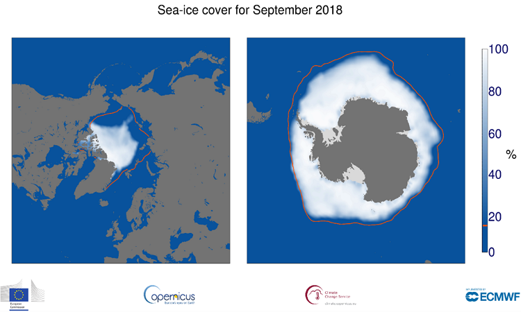 Sea ice: Arctic sea-ice extent was well below average throughout 2018 and was at record-low levels for the first two months of the year. The annual maximum occurred in mid-March and was the third lowest March extent in the 1979-2018 satellite record. The September monthly sea ice extent was the sixth smallest September extent on record. The 12 smallest September extents have all occurred since 2007. At the end of 2018, the daily ice extent was near record low levels.