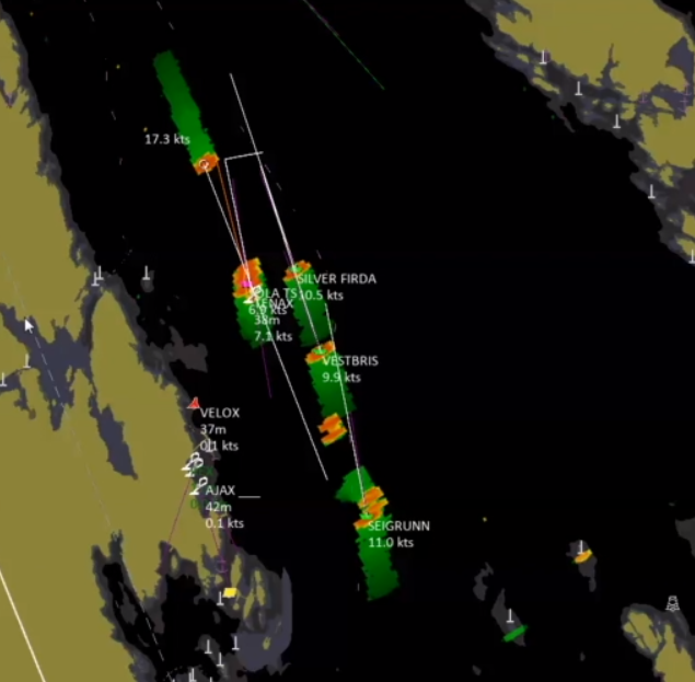Video still from VTS tracking in the moments before the collision; the Ingstad is the unnamed radar target at top left (social media)