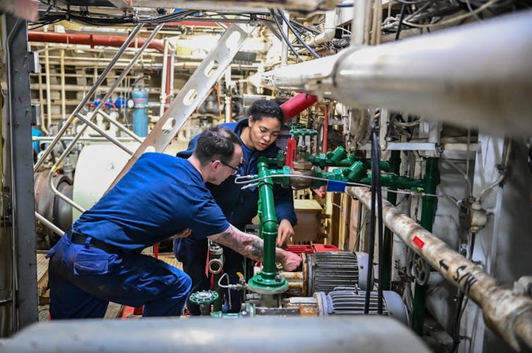 Engineers aboard the Polar Star fix a saltwater pump while in the Bering Sea on Jan. 28, 2021 (Cynthia Oldham/U.S. Coast Guard)