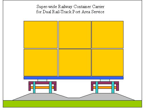 Each of the super-wide railway cars would couple via central couplers. The central track on which locomotives travel would be meter gauge, with each of the outer tracks on which super-wide cars travel would also be the meter gauge. Following North American unit train practice, locomotives would be spread throughout each container train. This arrangement could move up to 900 forty-foot containers for every 50-car section of train, with a four-section train propelled by four-groups of locomotives moving up to 3,600 containers. University railway research departments would need to undertake further research to make the concept workable.