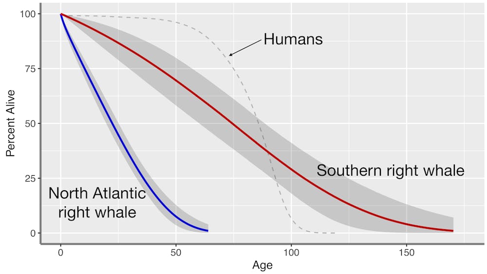 We made these new age estimates using photo identification of individual female whales over several decades. Individual whales can be recognized year after year from photographs. When they die, they stop being photographically “resighted” and disappear. Using these photos, we developed what scientists call “survivorship curves” by estimating the probability whales would disappear from the photographic record as they aged. From these survivorship curves, we could estimate maximum potential lifespans.