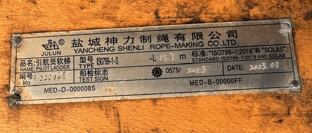 Despite the fact that the ladder was only one year old, it was in a deplorable condition. The deck crew had been busy with the ladder for several hours. I could not check if the required repair rope had been used (three-ply tarred Marline of a minimum breaking strength of 800N and with a minimum diameter of 4mm or other suitable material of equivalent strength and diameter as per ISO799-1:2019 rule 4.7).