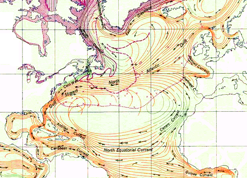 The Sargasso Sea in the North Atlantic is bounded by the Gulf Stream to the west, the North Atlantic Current to the north, the Canary Current to the east, and the North Equatorial Current to the south. Jack/Wikipedia