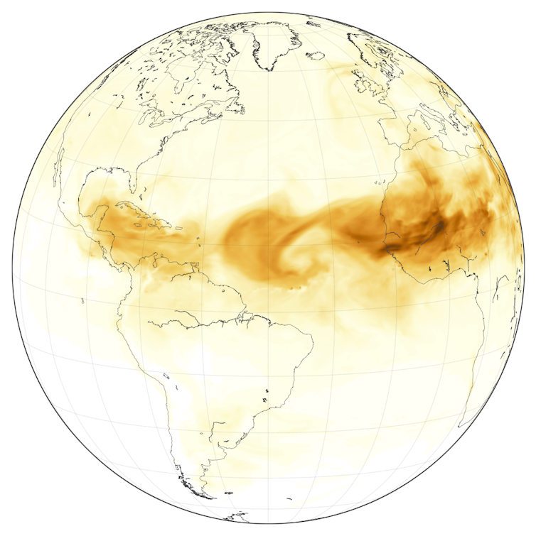 This map shows dust from a series of Saharan storms crossing the Atlantic on June 28, 2018. NASA Earth Observatory