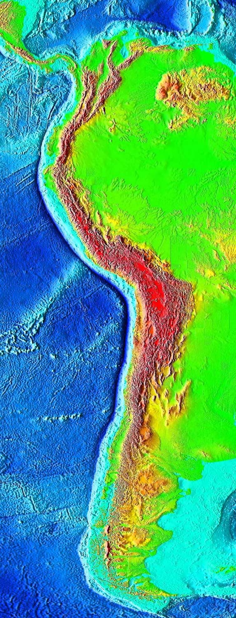 Sometimes called the Peru-Chile Trench, the Atacama Trench is visible in dark blue on this relief map (sea level is green and mountains are red). (Left, NOAA)