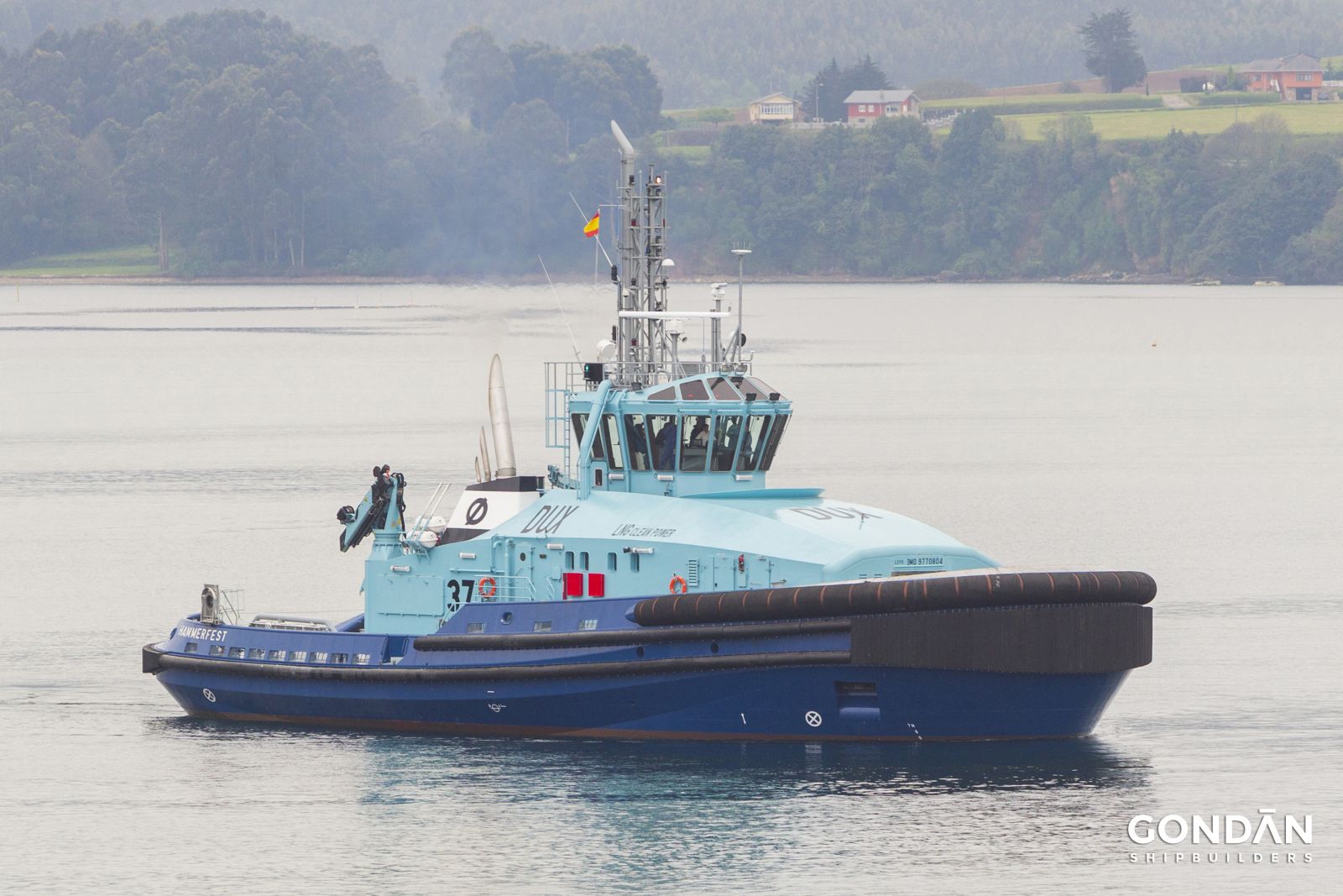 That honour, most fittingly, goes to the Dux, the first of three ultra-high performance dual fuel escort tugs built by Gondan Shipyard in Spain for Østensjø Rederi of Norway. Johannes Østensjø was the first Owner in Europe to purchase a Robert Allan Ltd. designed tug and our subsequent work with that fine company has always been “extra special”, including tugs of truly innovative and specialized designs as illustrated by figures 11 to 13, with both VSP and Z-drive propulsion. Now the Dux, figure 14, and her two sisters will be the first dual-fuel escort tugs in the world.