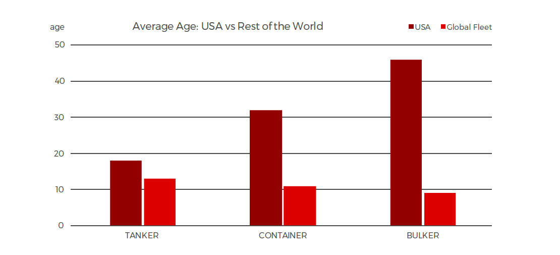 Nonetheless, the US-built bulker fleet has an average age of 46 years versus nine years for the global fleet. Even a relatively modern ship type, such as container vessels, are on average 32 years old, positively ancient compared to an average of 11 years old for non-US built vessels.