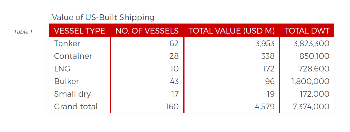 There are currently 160 U.S.-built bulkers, tankers and gas carrier vessels on order or on the water (see Table 1). The total capacity of these vessels is just over seven million dwt, with a total current value of $4.5 billion. Globally, the U.S. is ranked in eleventh place by shipbuilding capacity and a respectable sixth place behind the South Korea, Japan, China, the Philippines, Germany and Turkey in terms of the current value of the American-built fleet.