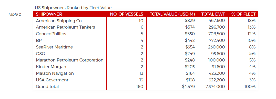 VesselsValue finds that the top ten US shipowners ranked by value control around half the capacity of the US fleet (see Table 2).