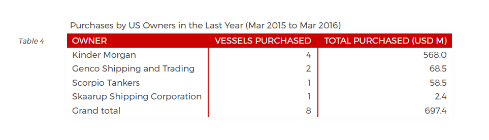 Of course, under the US Jones Act, US companies cannot purchase foreign-built vessels to operate in US waters. This reduces the pool of potential purchases, which in the last twelve months have been limited to just eight vessels, including four MR tankers from Philly Shipyard purchased by Kinder Morgan for a reported $568 million.