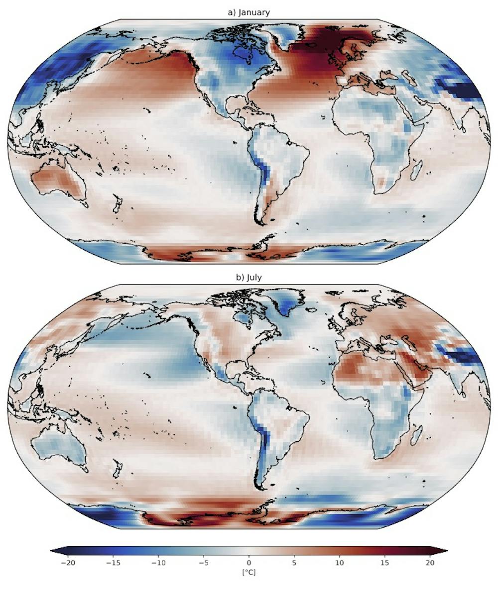 Surface air temperature departure from 1948-2018 zonal average in January (top) and July (bottom). Marsh & van Sebille, 2021; Data: NCEP/NCAR, Author provided