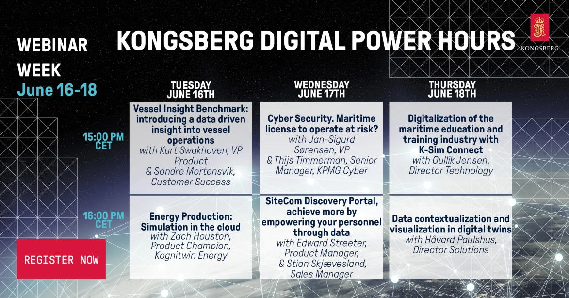 Hosted by some of the leading experts in the industry, the webinars – which will run from Tuesday June 16 to Thursday June 18 – take the form of ‘Power Hours’ with two consecutive sessions, the first starting at 1500 hours CET and the second at 1600 hours CET. An opportunity for Q&A is included within each webinar, making them a time-efficient way to obtain the latest information about Kongsberg Digital’s wide range of digital solutions, and to learn how digitalization can help your business.